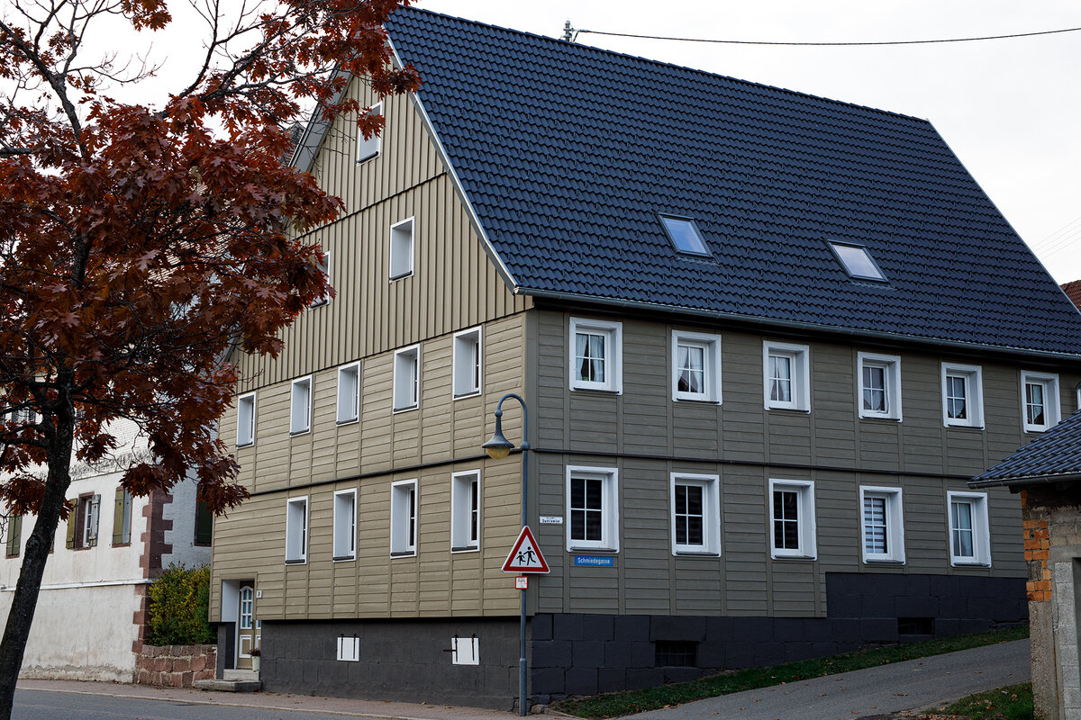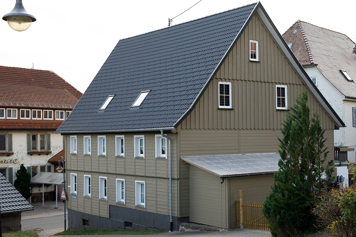 Abriss der alten Schindelfassade, Fassade neu gedämmt und mit einer Holzschalung verkleidet (unten Stulpschalung, oben Boden Deckelschalung)
