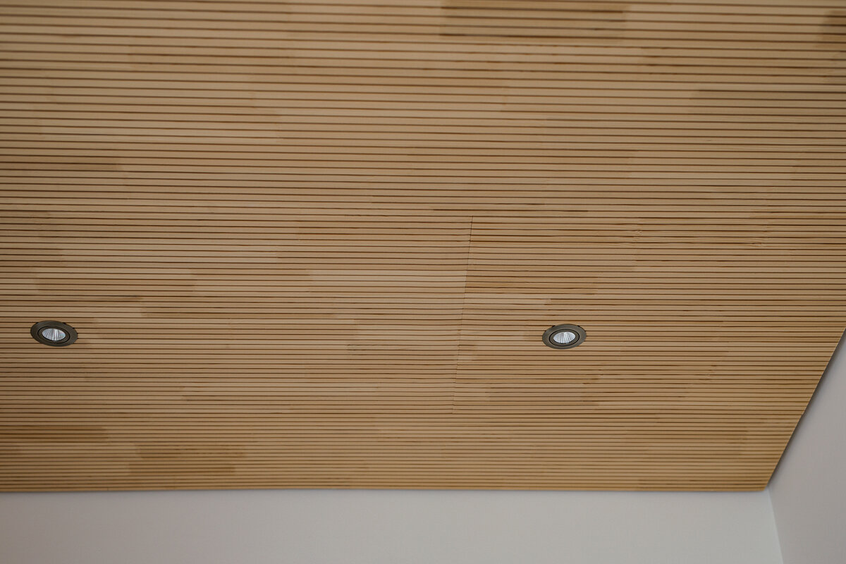 Im Innenbereich wurde eine Akustik-Holzdecke aus Weißtanne verlegt.