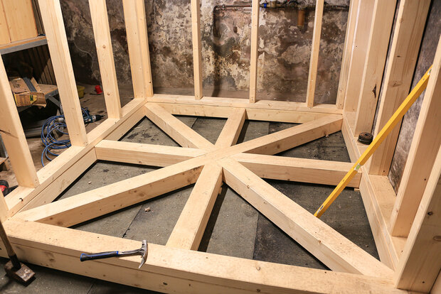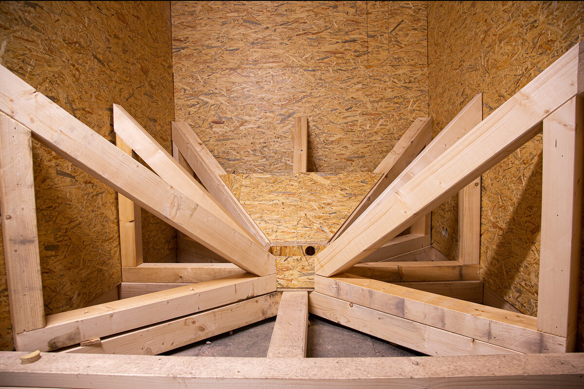 Bei diesem Objekt mußten erst Teerbahnen auf dem Fußboden verschweißt werden. Damit keine Feuchtigkeit vom Kellerboden (Sandsteinkeller) hochsteigt. Danach wurde das Pelletlager aus einheimischen Hölzern errichtet. Ein kleiner Einstieg und ein Plexiglasfenster wurden zur Wartung und Kontrolle angebracht.