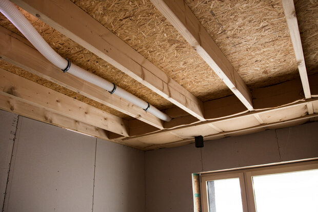 Neubau eines Passivhauses mit Holzrahmenbauwänden.